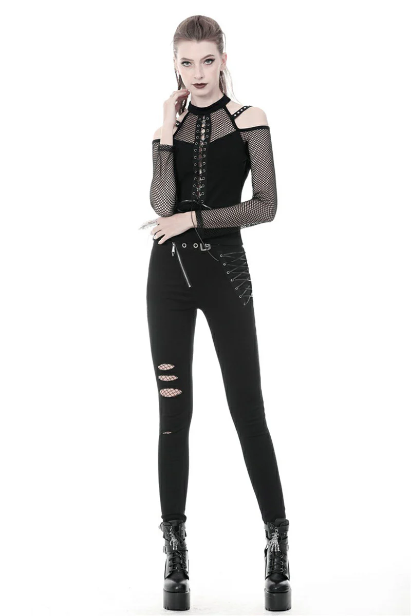 Lead the legions in this fierce fishnet top! You’re dark as you are deadly in the plunging corset design, designed to please and leave ‘em wanting more. Give haters the cold shoulder in the statement shoulder cutouts, romanced with accents straps and silver eyelets. Pair this fishnet top with skinny jeans and combat boots, and their hearts will be yours to command…